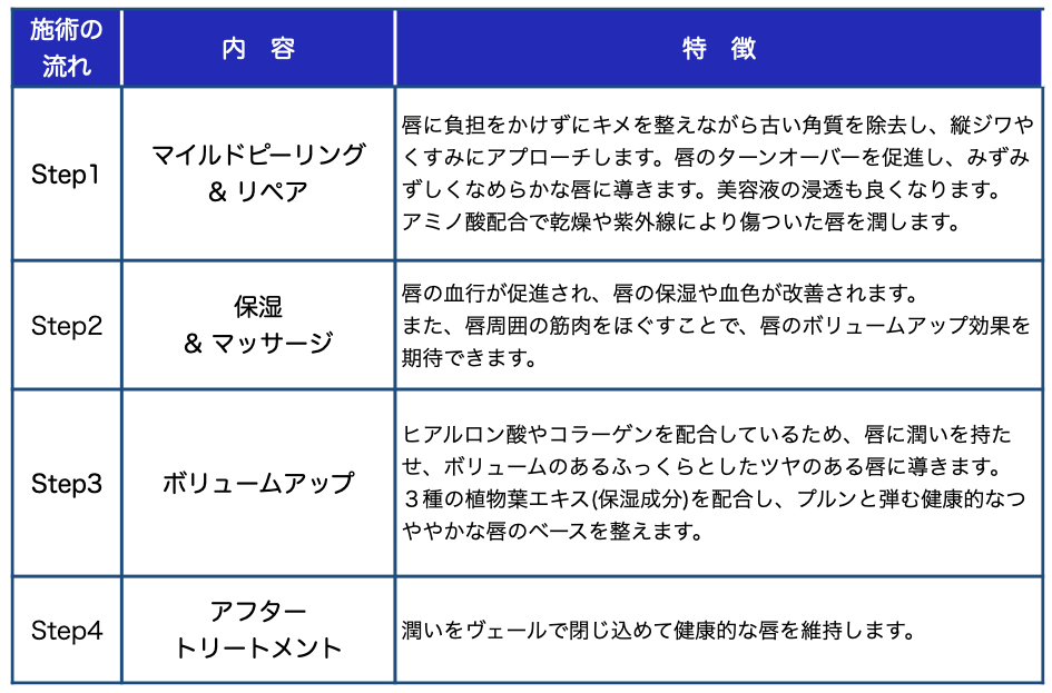 専用の材料を使用しますので、まずは基本(1回のみ)をお試しください。リップエステによって、唇のターンオーバーを促し、正常な唇に導きます。